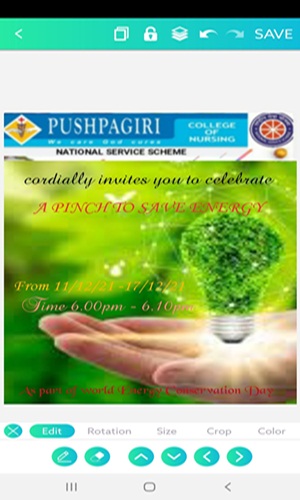 The National Service Scheme unit (NSS/FU/PNT/KUHS/2) of Pushpagiri College of Nursing observed A PINCH TO SAVE ENERGY in relation to World Energy Conservation Day from 11th to 17th December 2021. The programme helped to create significance of saving electricity among the volunteers. It also create awareness among the volunteers regarding the conservation of electrical energy for future generation. A total of 50 Volunteers participated in the event. The volunteers celebrated the event by switch off the lights and fans at the peak time from 6.00pm to 6.10 pm and they lighted the candles for 10 minutes. A total of 7 days they celebrated the event. The programme is very enthusiastic for the volunteers.
