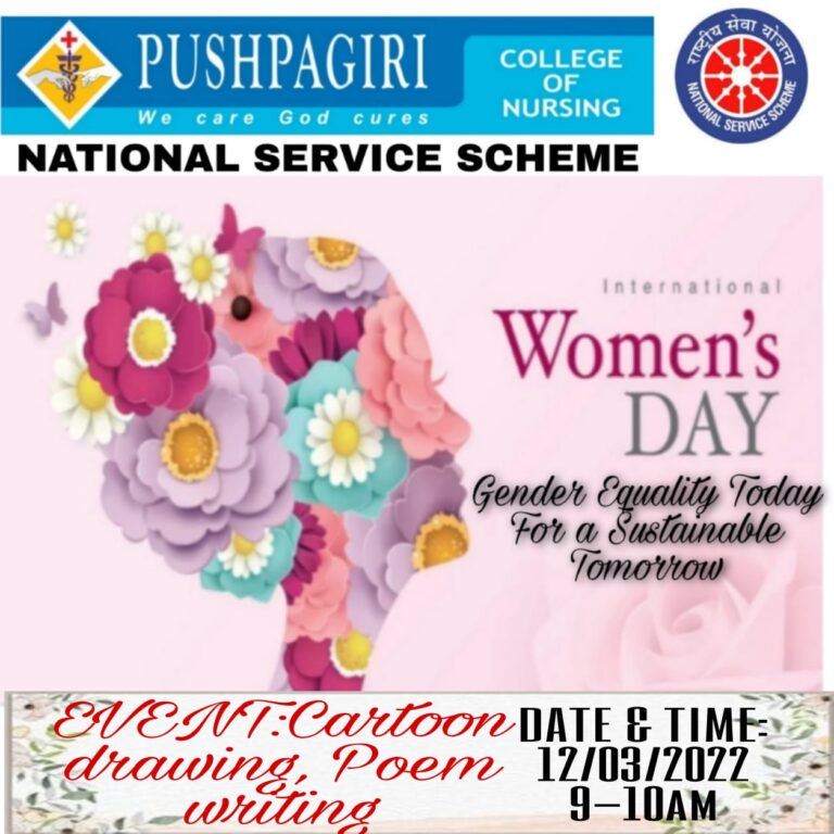 The National Service Scheme unit (NSS/FU/PNT/KUHS/2) of Pushpagiri College of Nursing observed the international women’s day on 12 March,2022 in the college premises. The Programme helped to create awareness about the importance of celebrating the international women’s day. This programme also helped to make an awareness on the significance of the day. There were around 09 volunteers participated in the cartoon drawing and poem writing contest organized in the college conducted on 12 March,2022 from 10 am to 11 a.m. A total of 4 evaluators evaluated the competition and prizes were distributed to the students by programme officer. The programme proved to be very motivating for the volunteers.