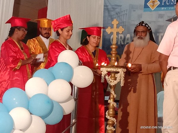 Graduation ceremony of the 9th batch MSc(N) and 16th batch of BSc Nursing students held at Pushpagiri College of Nursing Auditorium on 18th August 2022 at 10.30am. His Grace Most Rev. Dr. Thomas Mar Koorilos, the Metropolitan Archbishop of the Malankara Archdiocese Tiruvalla inaugurated the ceremony. Rev. Fr. Aby Vadakumthala, Director- Institutions, presided over the function. The Chief guest for the day was Dr. Anoopa K. R., Principal, Bishop Benziger College of Nursing, Kollam and the first Vice Principal of Pushpagiri College of Nursing, Tiruvalla. Dr. Aby Mathew T, Principal, Pushpagiri College of Dental Sciences, Prof. Mrs. Sariga J. Theresa, CNO, Pushpagiri Medical College Hospital and Mr. Sajeev Joseph, PTA representative felicitated the graduates. The college magazine Synergy was released by Fr. Jose Kallumalickal, CEO, Pushpagiri group of Institutions. The certificates to the graduates were distributed by Rev. Jose Kallumalickal and Rev. Fr. Aby Vadakumthala.