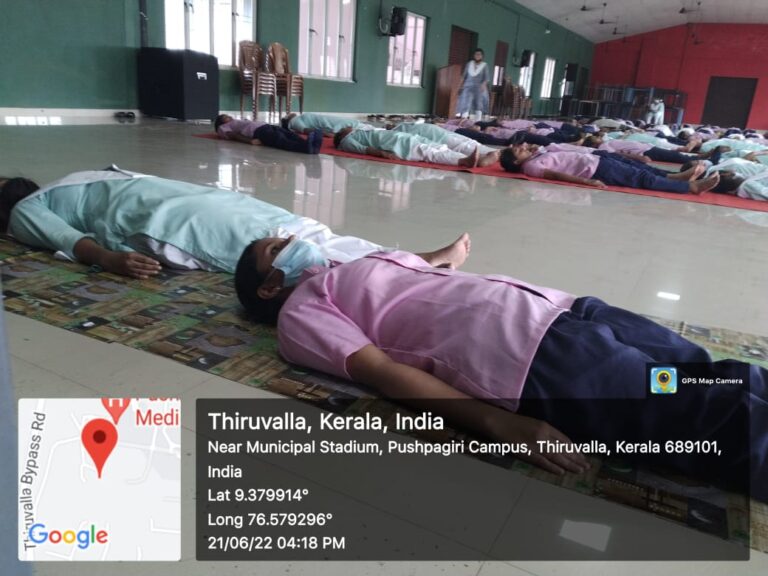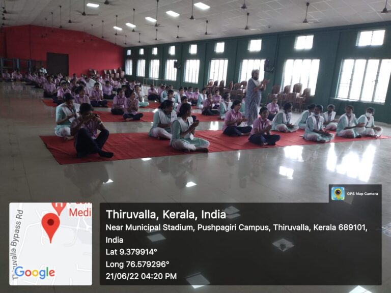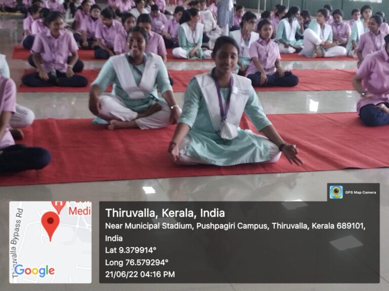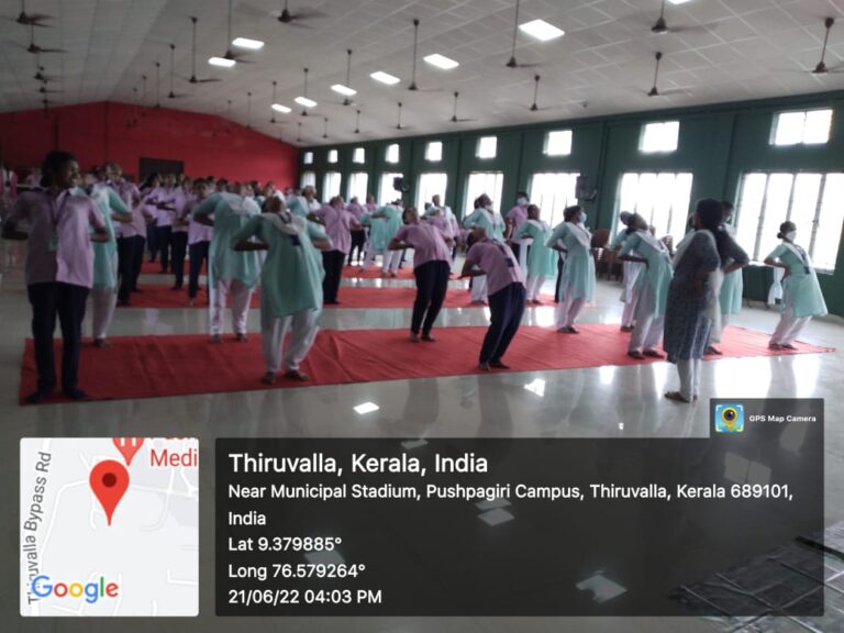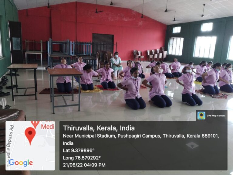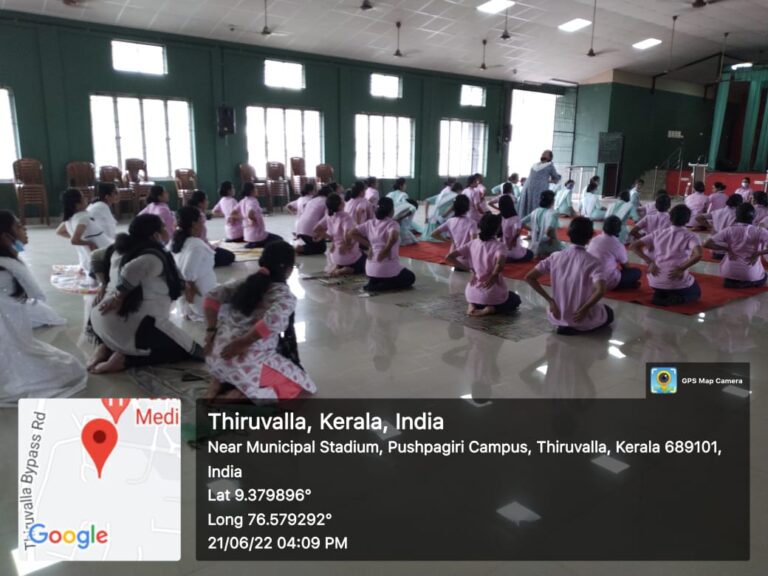 Yoga is a medicine for the mind, body and soul. It heals and restores, rejuvenates our senses and gives us a renewed sense of well being. Including this in our curriculum is important both for stress relief and body wear and tear processes. The 8 th International yoga day was celebrated on the theme yoga for harmony in the pushpagiri college of nursing on the occasion on June 21,2022. It was a fruitful one conducted in 2 seperate sessions for students and staff by the NSS program officer and associate program officer. The program started with viewing the Pm address live from Mysore palace including live demonstrations. Around 120 students in total participated in the sessions including 15 teaching faculty members. The program was conducted following covid appropriate behaviour and protocol. This program was conducted in collaboration with the NSS UNIT AND DEPARTMENT OF OBSTETRICS AND GYNAECOLOGICAL NURSING UNDER THE ABLE INSTRUCTIONS OF PROF. MRS RENJINI DEVI.