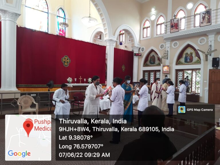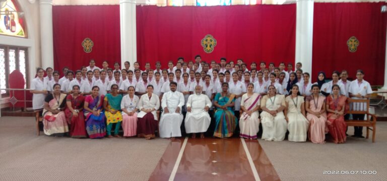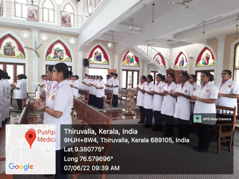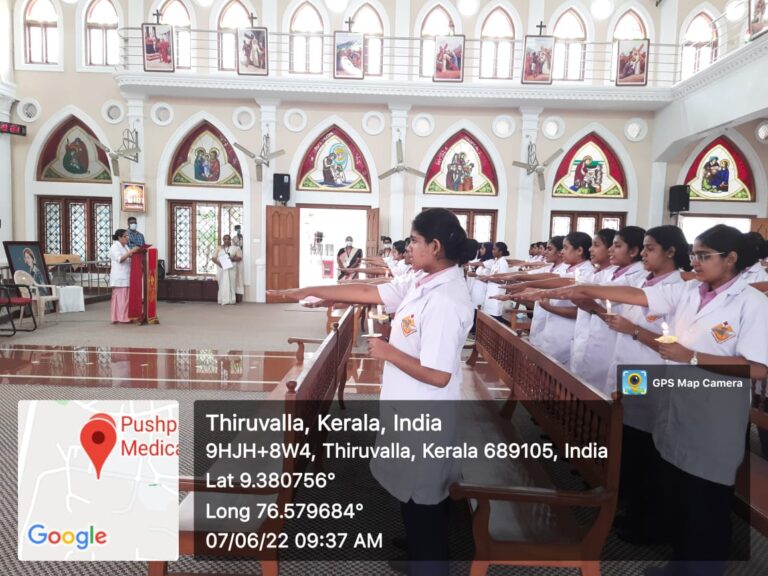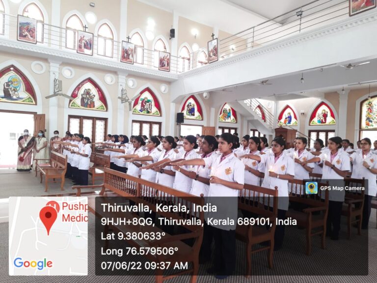 The lamp lighting ceremony for the 19th batch of BSc Nursing students of Pushpagiri College of Nursing was held on 7th June 2022 between 9am to 10am.The ceremony commenced at 9am with the prayer song and bible reading by 1st year BSc nursing students, respectively Mrs.Renjini Devi Vice principal Academics PCON welcomed the gathering, Rev.Fr.Jose Kallumalickal,CEO PIMS blessed the students, Prof.Vineetha Jacob principal PCON addressed the students and emphasized the importance of acquiring knowledge and skill. 75 students lightened the lamp and they recited the Nursing pledge.