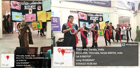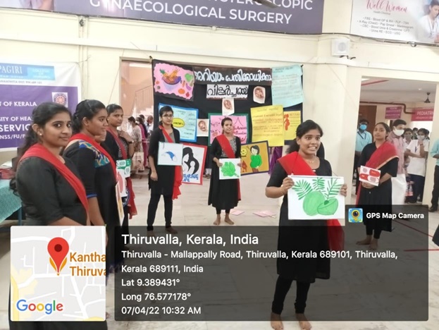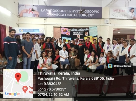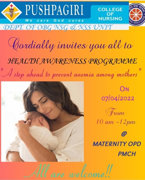 as World Health Day on 07/04/2022 at Maternity OPD, Pushpagiri Medical College Hospital from 10 am to 12 pm. The programme was conducted in collaboration with Obstetrical and Gynaecological Nursing Department. The programme mainly focus on Theme 02(Test,Treat,and Talk on Anaemia) and Theme 03 (Traditional food for Mother and Child in tribal Area) of Swastha Balak Balika Spardha(SBSS). The chief Guest of the programme was Dr.Sreedevi (HOD of Obstetrics and Gynaecological Medicine, Pushpagiri Medical College Hospital, Thiruvalla) and prof. Renjini Devi S ( HOD of Obstetrical and Gynecological Nursing). Mrs.Asha Ashok, NSS programme officer and Mra.Anila Velayudhan Assistant professor of Pushpagiri College of Nursing were also present during the programme and supported the volunteers. The programme was inaugurated by Dr.Sreedevi and had given a talk on Anaemia, how to test anaemia and what are measures to prevent anaemia. She also added the importance of taking traditional food. Prof. Renjini Devi S( HOD of Obstetrical and Gynecological Nursing) had given message regarding the importance of preventing anemia as well as the importance of traditional foods. The volunteers played a street play on the basis of Theme 02 and 03 of SWASTH BALAK BALIKA SPARDHA in Maternity OPD. There were a group of masses observed the programme. The programme created a great valuable message to the public. This programme created a insight of public health awareness among the volunteers.