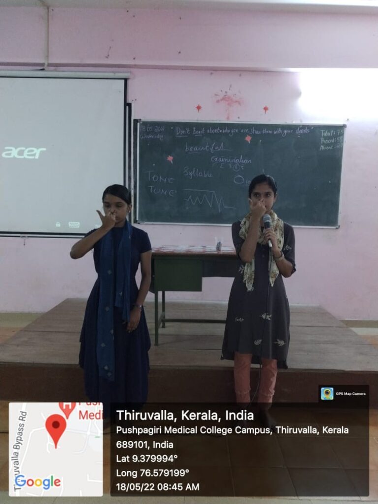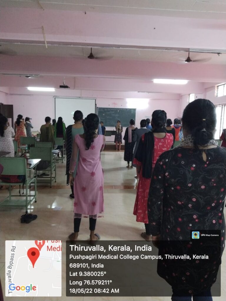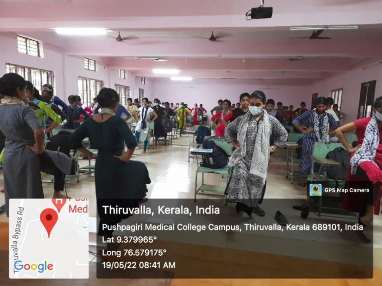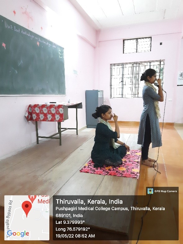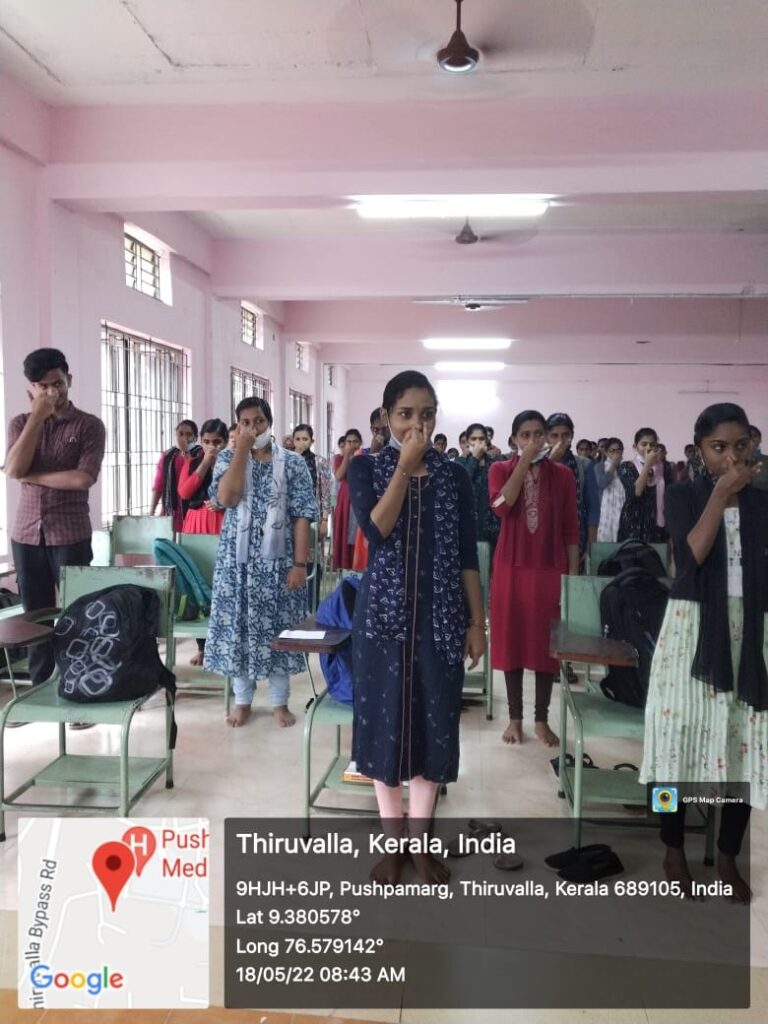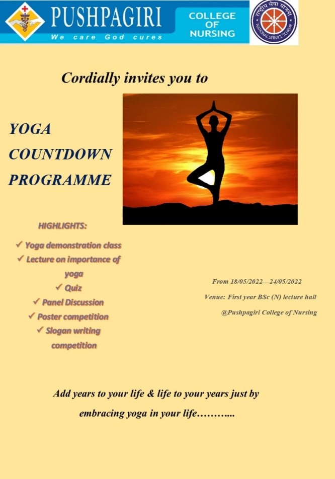 The National Service Scheme unit of Pushpagiri College of Nursing observed the Yoga count down programme as a preparation for International Yoga day from 18/05/2022 to 24/05/2022 at Pushpagiri college of nursing, Thiruvalla. A total of 75 volunteers proactively participated in the programme. The programme favours the volunteers to understand the importance of Yoga in day-to-day life. This programme also helped the volunteers to get rid from stress and improved concentration as well as academic performance. It created the ability to practice yoga on daily basis. The highlights of the programme were Yoga Demonstration classes, Lecture on importance of Yoga, Quiz, Panel Discussion, Poster and Slogan writing competitions. One-week session was done on the basis of these highlights.