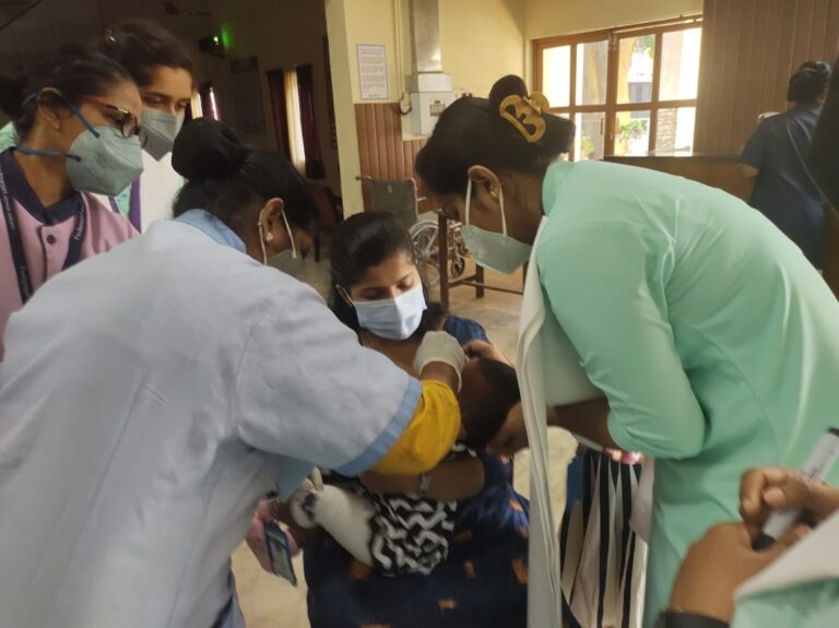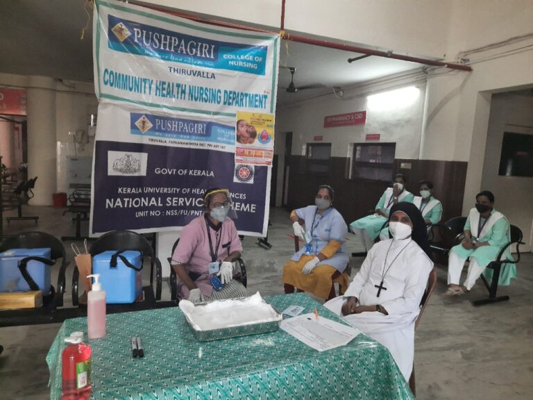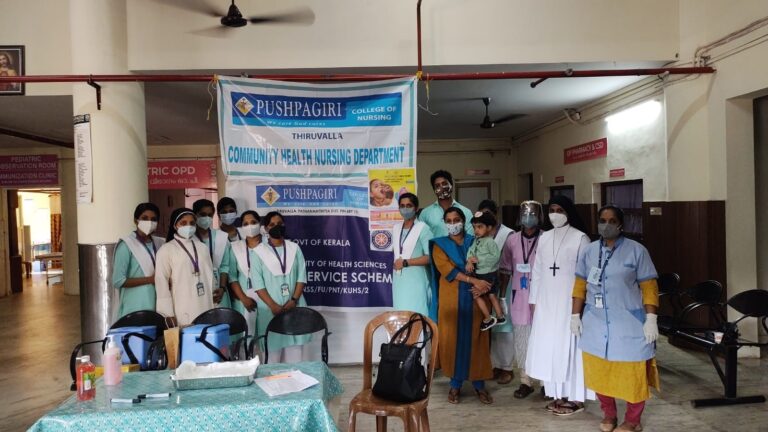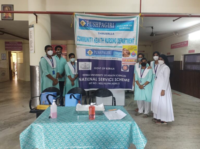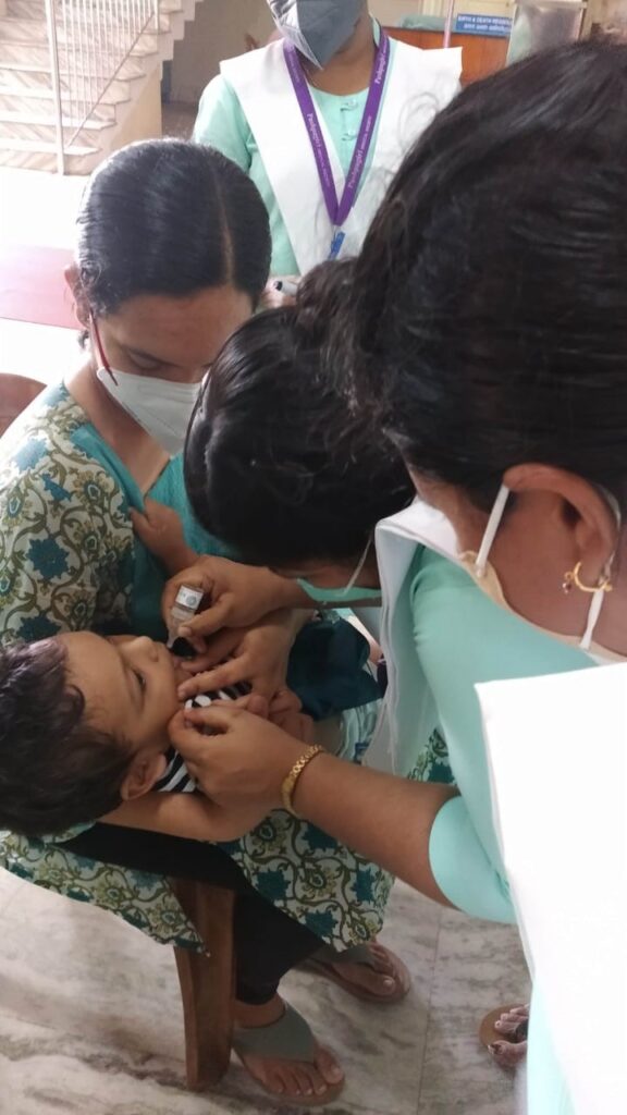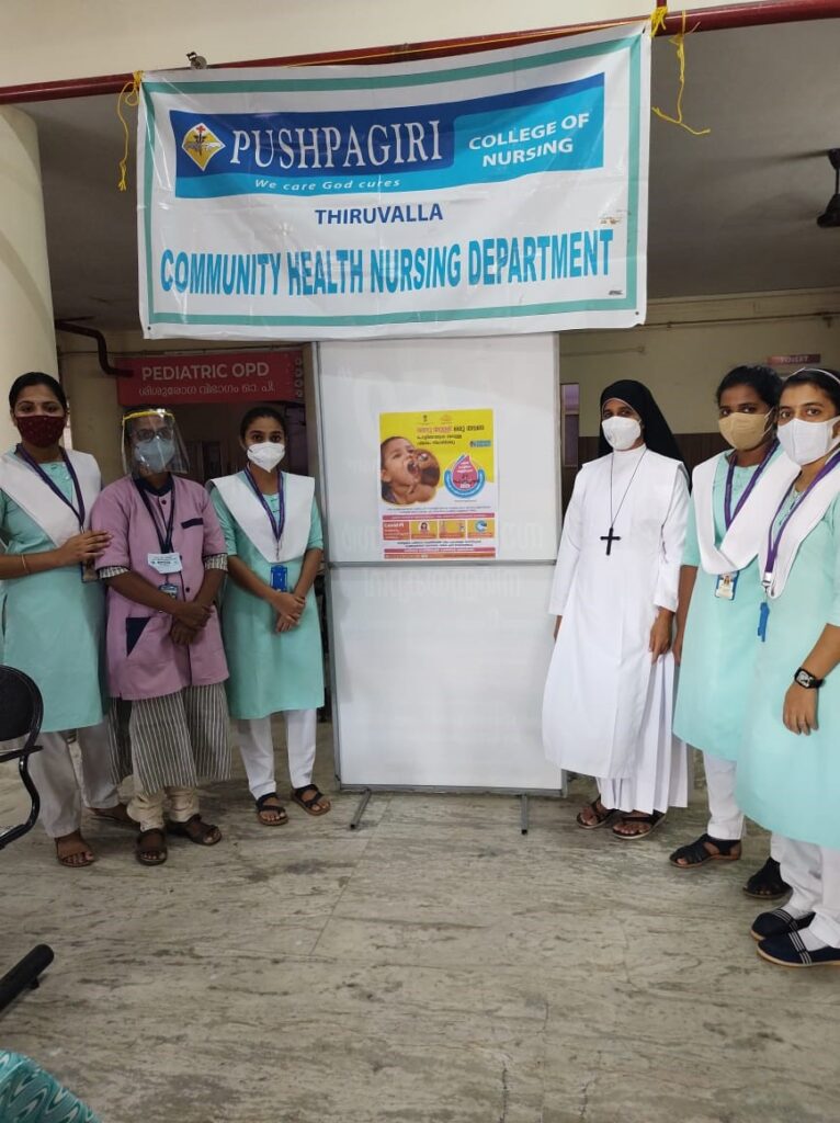 On 27 th of February 2022, Community Health Nursing Department and NSS unit of Pushpagiri College of Nursing had participated in Pulse Polio Immunisation programme organised by Government of India.During this programme we 2nd 25 students of 4 th year BSc Nursing got an opportunity to participate in this programme under the guidance of Sr.Mayukha SIC ,Associate professor , Community Health Nursing and Mrs.Asha Ashok,NSS Coordinator.The program was conducted in Immunisation OPD of Pushpagiri Medical College Hospital and Mrs.Annamma and Mrs.Josmi were the team members in PMCH .The time was scheduled from 8am to 5 pm.The total houses which comes under this setting was 568 ,which covers 1735 population including under 5 children. Poliomyelitis is highly infectious viral disease that can affect and can lead to partial ot full paralysis. The causative agent id is the polio virus which has three Serotypes 1,2 and 3. When an individual susceptible to polio is exposed to infection, one of the following responses may occur: Subclinical: There are no presenting symptoms,minor illness: It causes a mild or self limiting illness,non-paralytic polio: Stiffness and pain in the neck and back,paralytic polio: flaccid paralysis, stiffness of neck and back. The paralysis is characterized as descending.Immunization is the sole effective means of preventing poliomyelitis. Both killed and live attenuated vaccines are available and both are safe and effective when used correctly. Inactivated(Salk) polio vaccine: Administered by IM injection or fractional dose by Intradermal injection. The first 3 doses are given at intervals of 1-2 months and 4 th dose 6 to 12 months after the third dose. Oral(Sabin) polio vaccine: It contains live attenuated virus. 2 drops are administered orally. Government of India conducted the first round of pulse polio immunization consisting of 2 immunization days 6 weeks apart on 9th December 1995 and 20 th January 1996. The first program conducted targeted all children under 3 years of age irrespective of their immunization status. Later on, as recommended by WHO, it was decided to increase the age group from under 3 to under 5 years.The term pulse has been used to describe this sudden, simultaneous, mass, administration of OPV on a single day to all children 0 to 5 years of age regardless of previous immunization. Pulse polio immunization occur as 2 records about four to six weeks apart during low transmission season of polio that is between November to February. An important improvement in PPI during 1998 has been the use of vaccine vial monitor. Colour monitor or labels are put on vaccine bottles. Each label has a circle of deep blue colour. Inside it is a white square which changes colour and gradually becomes blue, if vaccine bottle is exposed to higher temperature.When the colour of the white square becomes blue like that of surrounding circle, the vaccine should be considered ineffective. There by the health worker can easily ascertain that the vaccine being given is effective or not. This mechanism has been mandatory in all vaccine procrements since 1998. This quality assurance will ensure that the children will have better protection against Polio in 1919 and and there after.Pulse polio immunization programme is included under National Health Mission, swatch Bharat, Beti Bachao Beti padhao and department of Health Services. The program was conducted in immunisation OPD of Pushpagiri Medical College Hospital. This was under Taluk Hospital Thiruvalla. Mrs.Annamma and Mrs.Josmi were the team members in PMCH. The time was scheduled from 8 a.m. to 5 p.m.. The total houses which came under this setting was 568 and which covers 1735 population including 65 under five children. The program was conducted in such a way that it strictly follows the covid protocol. Wearing face mask, practicing social distance 3 feet and prompt handwashing aids in better implementation of the program. A total of 65 children under 5 years came for immunisation programme.It was really a great opportunity for us ,as it helped us to know more about the immunization programme and were able to administer 2 drops oral polio vaccine to children.We convey our sincere gratitude to Sr.Mayukha SIC and Mrs.Asha Ashok for organizing such a platform for us.We are also thankful towards Pushpagiri Medical College Hospital for allowing us to become part of this campaign.