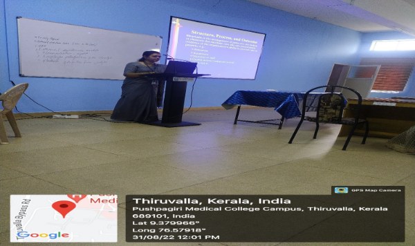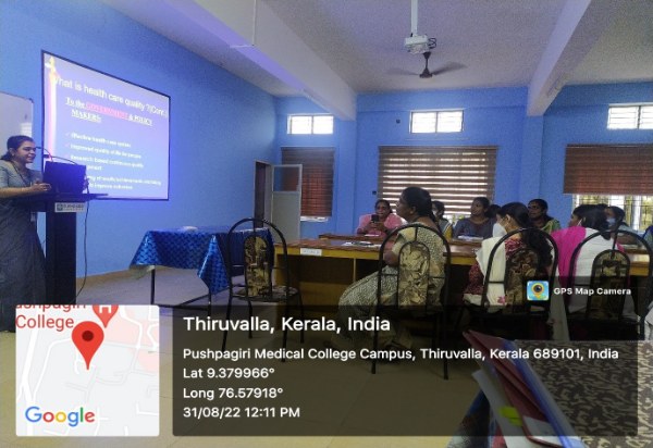 As a part of continuing nursing education, mental Health Nursing department organized a programme on Quality Assurance in Nursing Education on 30/08/2022. Pushpagiri Medical College Hospital and Research Centre chief Quality manager Mrs. Renuka Devi took class for the faculties. All the faculties except those on leave were present in the class. The class was beneficial for the faculties.