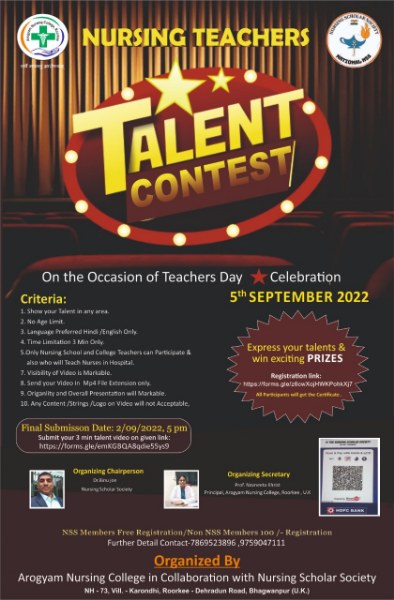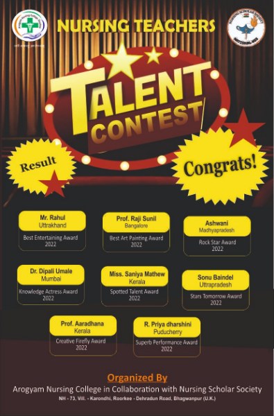 Teachers also participated in the online Nursing Teachers Talent contest organized on the occasion of Teachers day by Arogyam Nursing College in association with Nursing Scholar Society. They were asked to upload short videos displaying their talents by 3rd September and the results were declared on 5th of September 2022. Saniya Mathew won the spotted talent award 2022 for her, on the spot script writing and acting. Mrs. Aradhana Maniappan won the Creative firefly award 2022. She had uploaded seven videos displaying English and hindi poetry, dance, painting, photography and gardening.