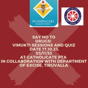 The National Service Scheme unit (NSS/FU/PNT/KUHS/2) of Pushpagiri College of nursing conducted the quiz competition to curb the practices of illicit drug abuse and also on the legislative aspects related to drugs including the judicial system in these spheres on 3/11/2023. Around 50 volunteers participated in the quiz competition. It was actively participated by all the volunteers. The winners of the quiz were MS. Jiza Varghese and Ms. Diya Susan Zacharia bagging the first and second positions. It was really a moment of great honor for the students, it was having an active and healthy competition among the volunteers. Now Ms Jiza Varghese will compete at the district level.