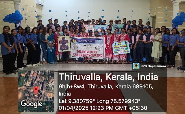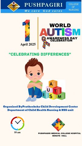 World Autism Awareness Day is observed every year on 2 April. This year theme is “Advancing Neurodiversity and the UN Sustainable Development Goals (SDGs)”. Child Health Nursing Department and NSS unit of Pushpagari College of Nursing participated in the Autism Awareness Day Programme organized by Pratheeksha, Child Development Centre Pushpagiri Medical College Hospital at Senate Hall on April 01. The programme was inaugurated by Dr. Manju George Elenjickal Professor & In charge of Child Development Centre followed by a session on Autism . Fifth semester students performed a dance and presented posters on Autism. Total of 40 students, 2 faculty from child health nursing department and 40 parents of Autistic children, Staffs of Child Development Centre were present for the programme. The programme helped to create an awareness and understanding on autism.