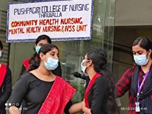 The Pushpagiri College of Nursing, Community Health Nursing, Mental Health Nursing department and NSS the B.Sc nursing 3rd years and 2nd years conducted the World disability day awareness program on December 8th, at Thiruvalla KSRTC stand, by organising a Flash Mob followed by a Street play with variety of AV aids on the theme of World disability day . A large crowd participated in the awareness program.