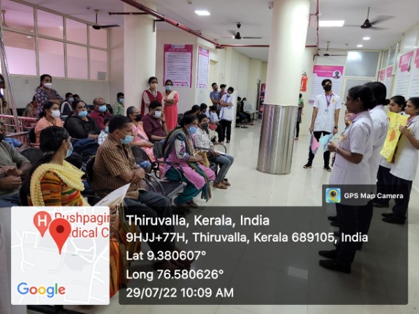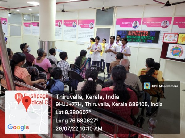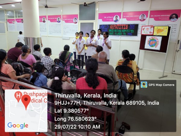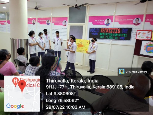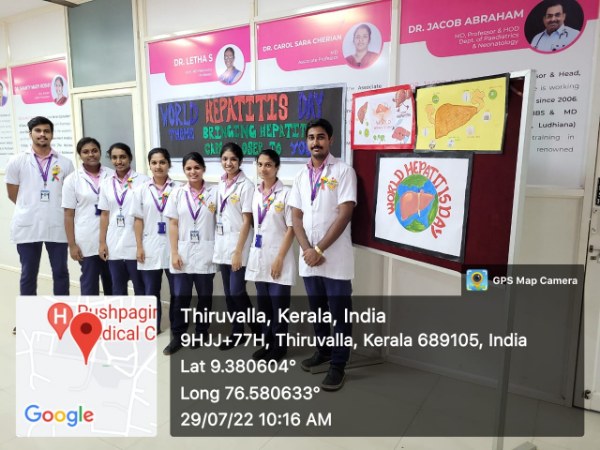 Child health nursing Department of pushpagiri College of Nursing, observed world hepatitis day..Third year Bsc nursing students conducted a group health education on ” hepatitis ” on 29/7/22 at Paediatric OPD..This year theme was “Bringiing hepatitis care closer to you”… Session was very informative..