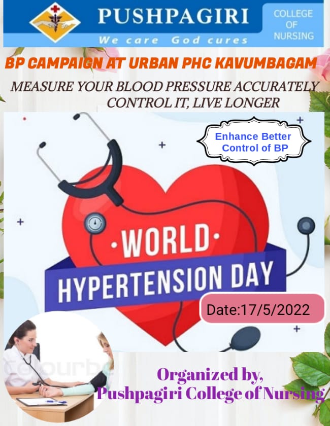 BP Campaign conducted by MSc 2nd Year students @ Urban PHC Kavumbhagom in view of World Hypertension day. Program was jointly organized by Dept. of Medical Surgical Nursing &Community health Nusing