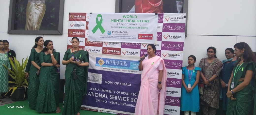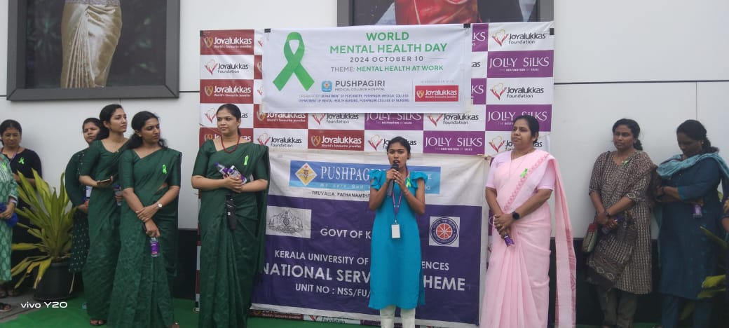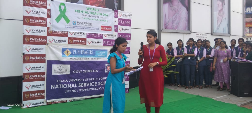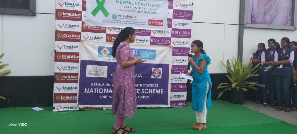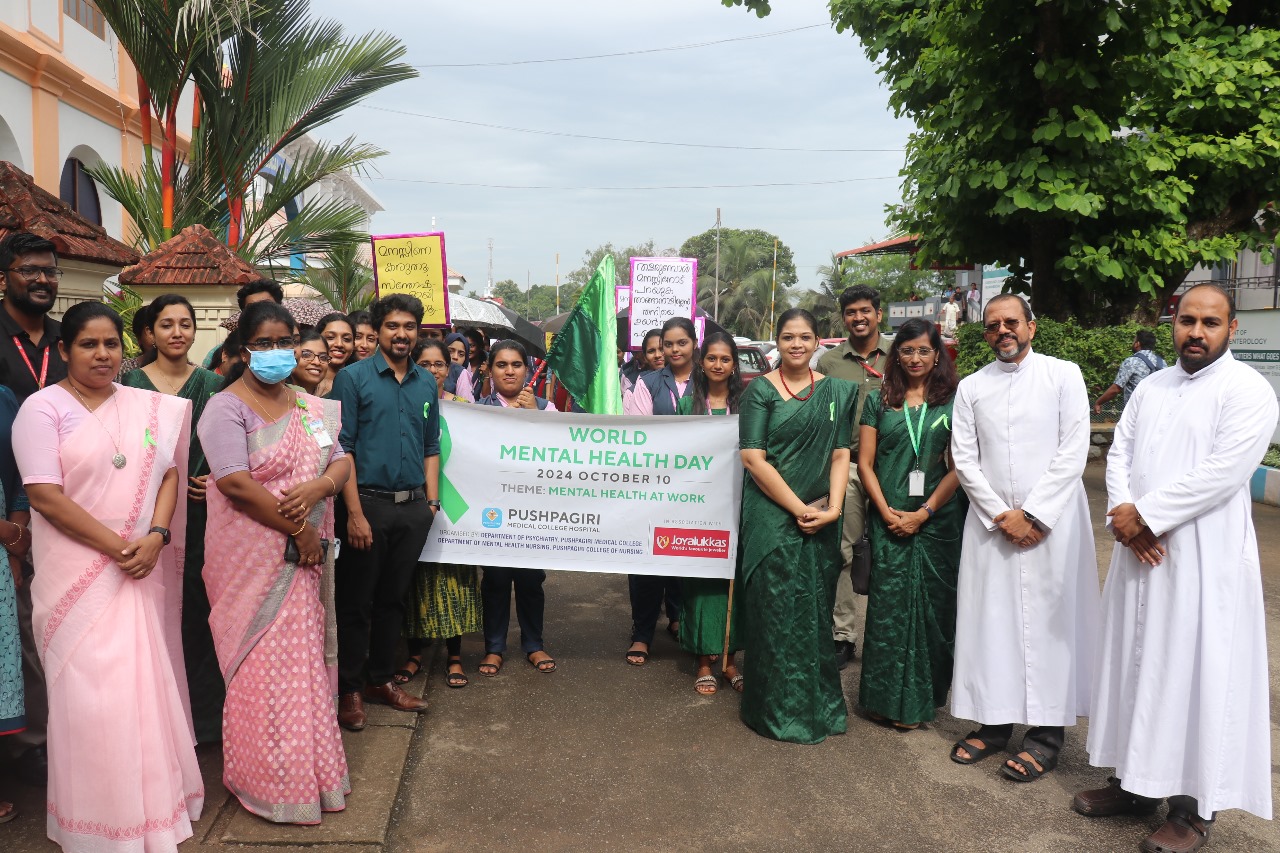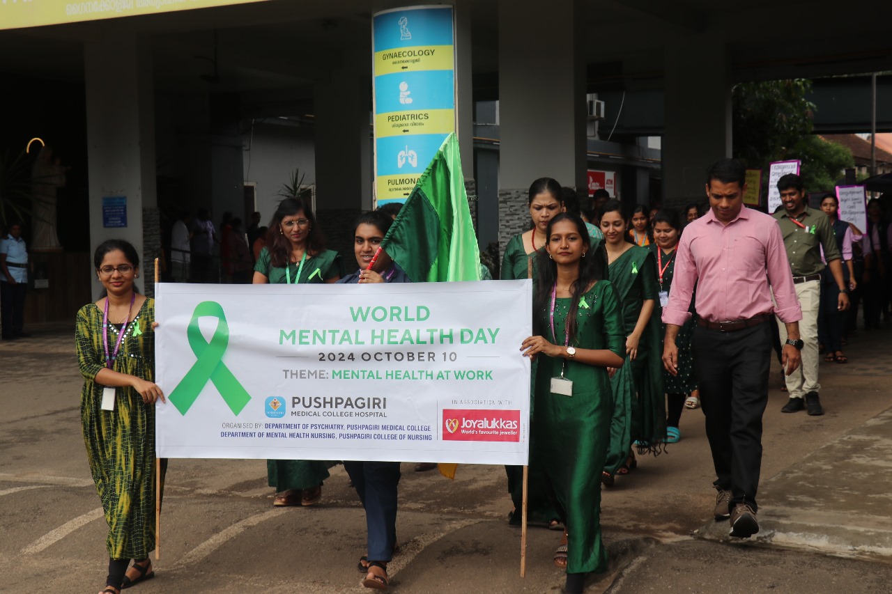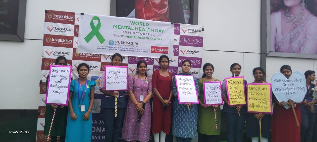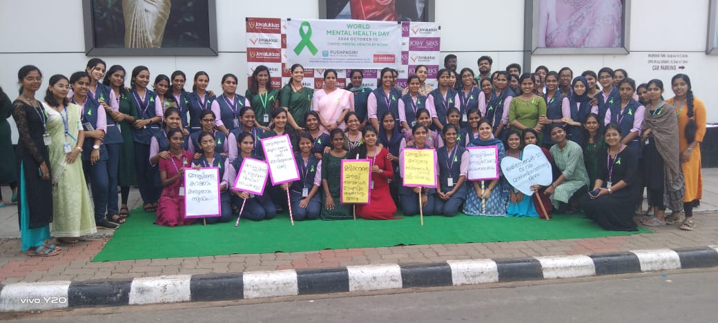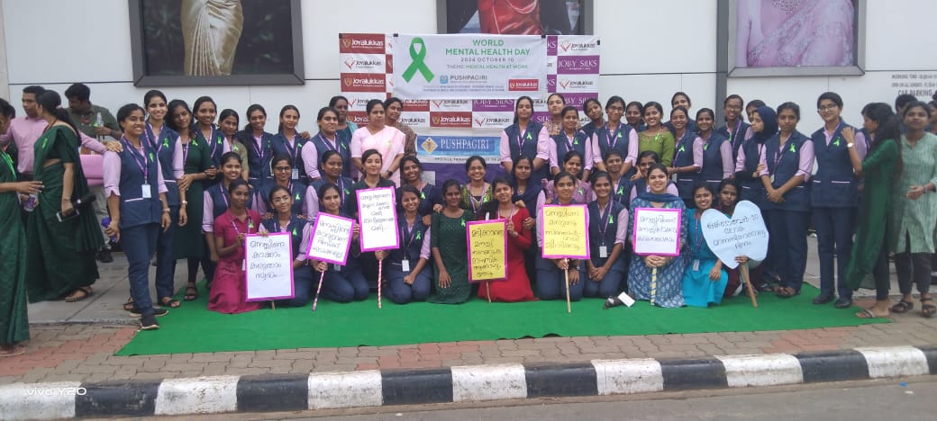 Awareness activities (public gathering, Rally, Flash mob and skit) for World Mental Health Day 2024 were organized by 6th-semester students from the Department of Mental Health Nursing, in collaboration with Pushpagiri Medical College Hospital and Joy Alukkas.